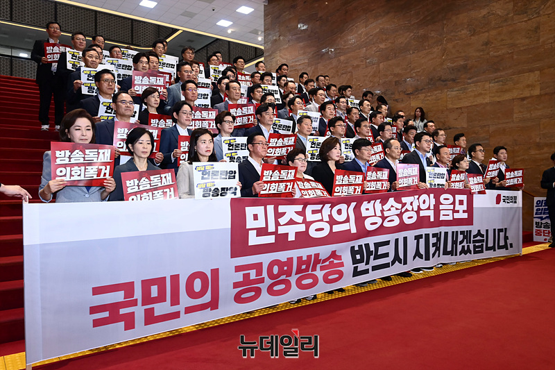 추경호 국민의힘 원내대표를 포함한 의원들이 30일 오전 서울 여의도 국회에서 열린 '방송4법 규탄대회'를 열고 구호를 외치고 있다.