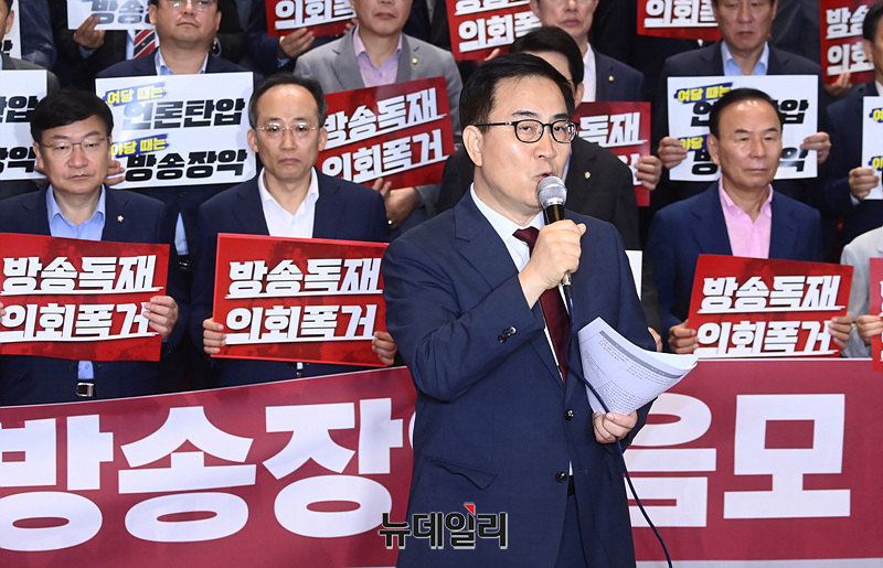 최형두 국민의힘 의원이 30일 오전 서울 여의도 국회에서 열린 '방송4법 규탄대회'에서 발언하고 있다.