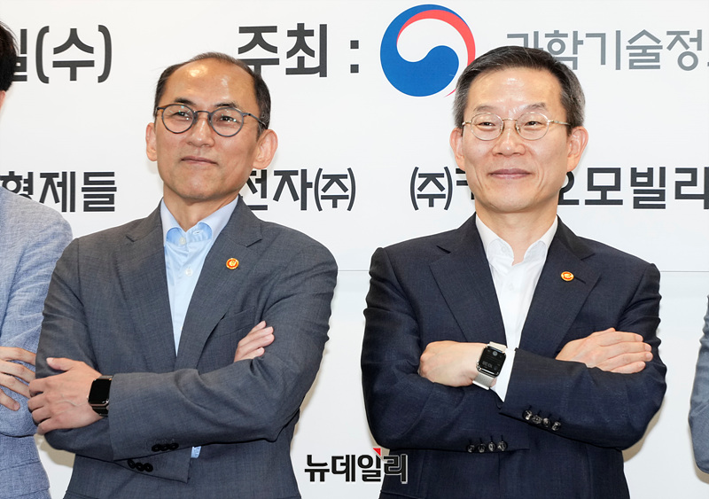 양청삼 개인정보보호위원회 개인정보정책국장(왼쪽부터), 이상민 뉴빌리티 대표, 김주현 우아한형제들 정책실장, 서한별 LG전자 상무, 고학수 개인정보보호위원회 위원장, 이종호 과학기술정보통신부 장관, 신승규 현대자동차 전무, 장성욱 카카오모빌리티 부사장, 정성균 포티투닷 상무, 엄열 과학기술정보통신부 정보통신정책관장이 31일 오전 서울 중구 한국지능정보사회진흥원에서 열린 '자율주행 산업발전을 위한 실증 현장 방문 및 간담회'에서 기념촬영을 하고 있다.