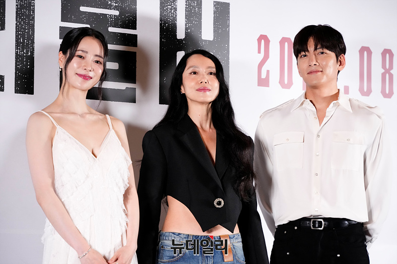 오승욱 감독, 배우 임지연, 전도연, 지창욱이 31일 오후 서울 강남구 메가박스 코엑스에서 열린 영화 '리볼버(감독 오승욱)' 언론시사회에서 포즈를 취하고 있다.