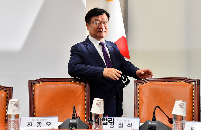 정점식 국민의힘 정책위의장이 1일 오전 국회에서 열린 최고위원회의에 참석하고 있다.