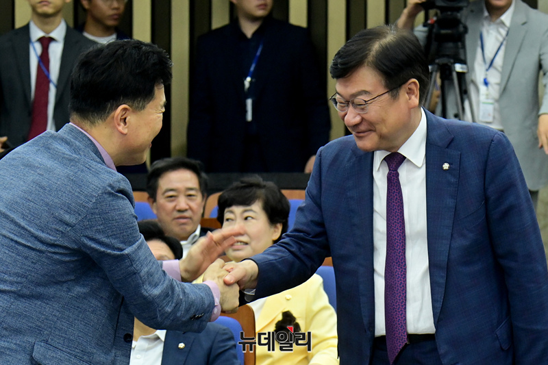 [포토] 의원들과 인사 나누는 정점식 국민의힘 정책위의장