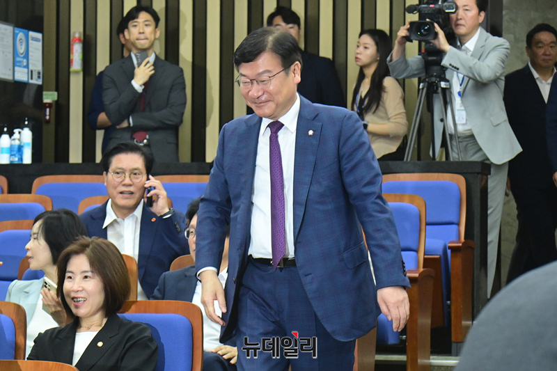 정점식 국민의힘 정책위의장이 1일 오전 국회에서 열린 의원총회에 참석하며 의원들과 인사를 나누고 있다.