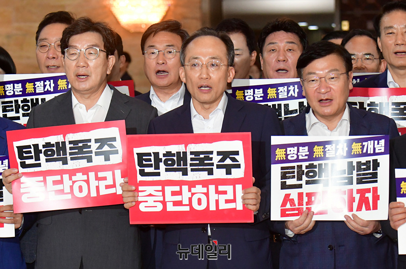 추경호 국민의힘 원내대표 및 소속의원들이 30일 오전 국회에서 열린 '민주당의 방송장악 음모' 규탄 대회에서 규탄구호를 외치고 있다.