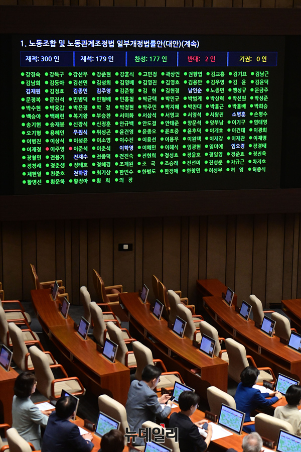 노동조합 및 노동관계조정법 일부개정법률안(노란봉투법)이 5일 오후 국회에서 열린 본회의에서 재적300인 중 재석 179인, 찬성 177인, 반대 2인으로 통과되고 있다.