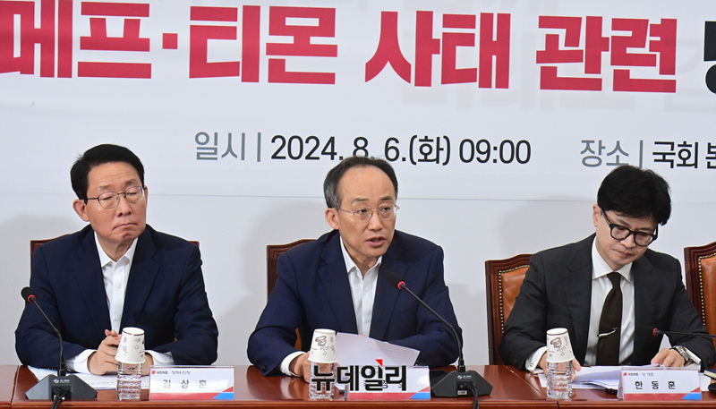 추경호 국민의힘 원내대표가 6일 국회에서 열린 위메프·티몬 사태 관련 당·정협의회에서 모두발언을 하고 있다.