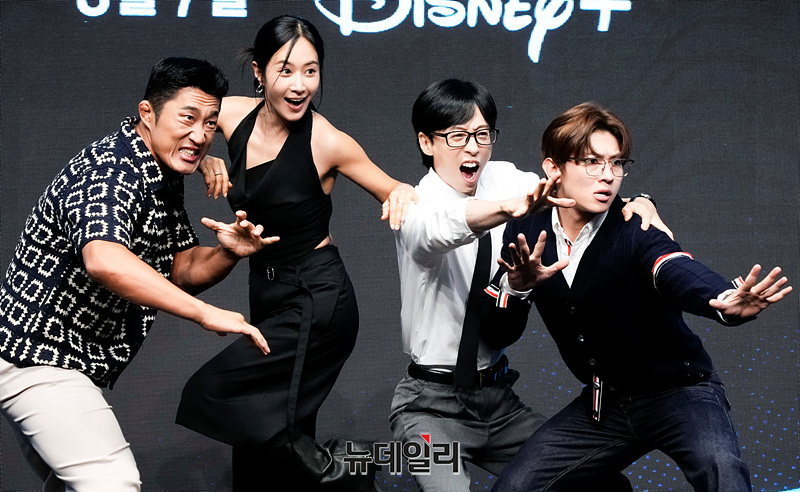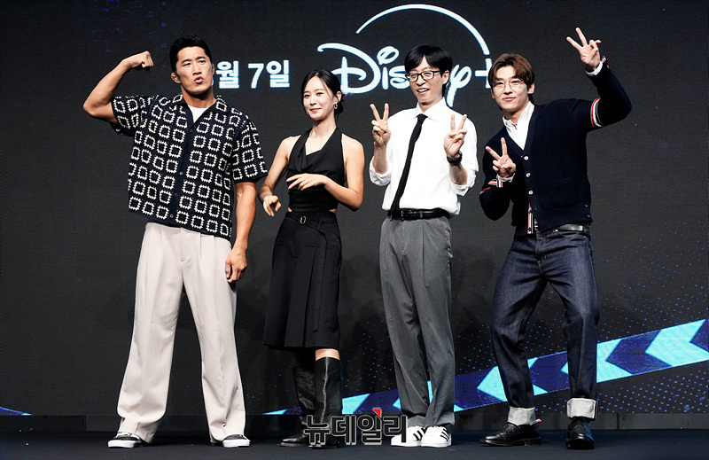 방송인 김동현, 유리, 유재석, 덱스가 6일 오전 서울 여의도 콘래드 호텔에서 열린 디즈니+ 오리지널 예능 '더 존: 버텨야 산다 시즌3' 제작발표회에서 포즈를 취하고 있다.