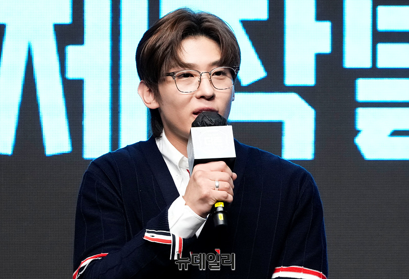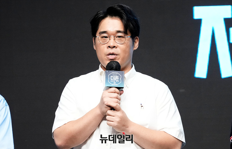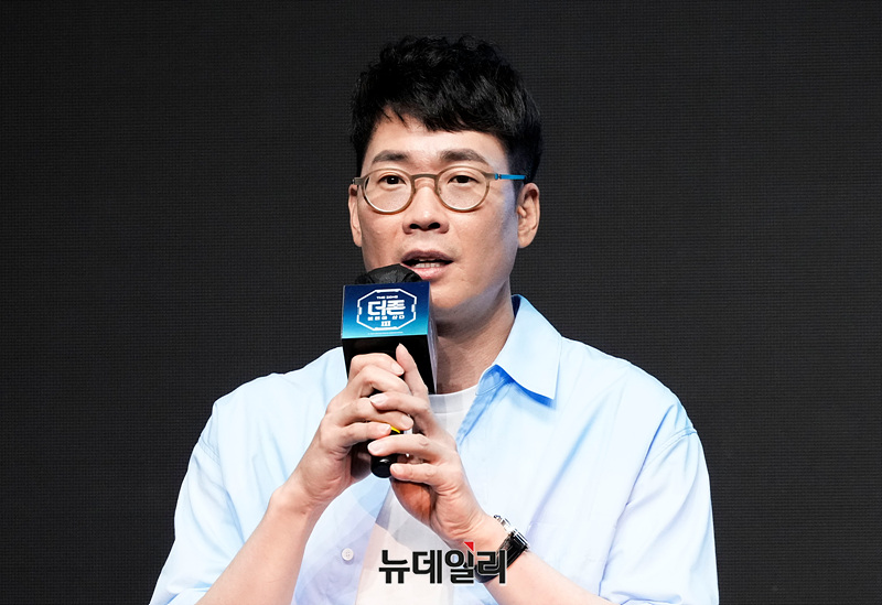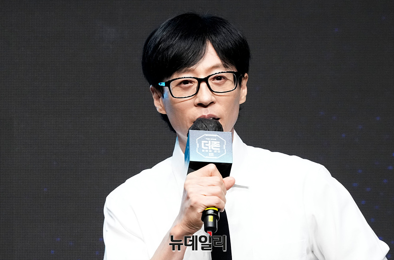 방송인 김동현, 유리, 유재석, 덱스, 조효진·김동진 PD가 6일 오전 서울 여의도 콘래드 호텔에서 열린 디즈니+ 오리지널 예능 '더 존: 버텨야 산다 시즌3' 제작발표회에서 취재진의 질문에 답하고 있다.