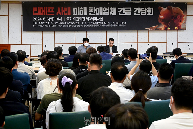 티메프 사태 피해 판매업체 긴급 간담회가 6일 오후 국회 의원회관에서 티메프 피해업체 및 중소벤처기업부 주최로 열리고 있다.