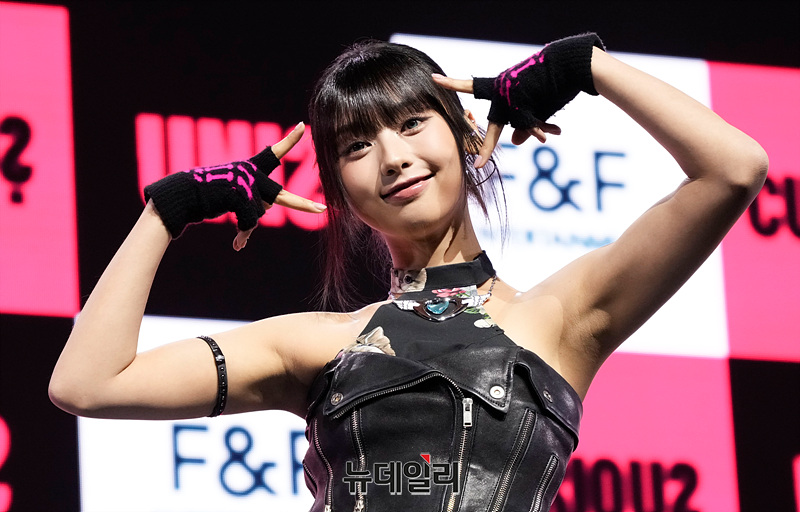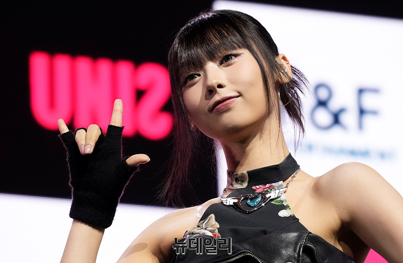 걸그룹 유니스(UNIS) 진현주가 6일 오후 서울 광진구 예스24 라이브홀에서 열린 싱글 1집 '큐리어스(CURIOUS)' 발매 기념 쇼케이스에서 포즈를 취하고 있다.