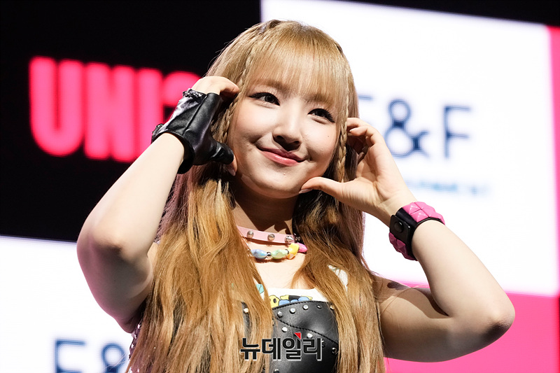 걸그룹 유니스(UNIS) 방윤하가 6일 오후 서울 광진구 예스24 라이브홀에서 열린 싱글 1집 '큐리어스(CURIOUS)' 발매 기념 쇼케이스에서 포즈를 취하고 있다.