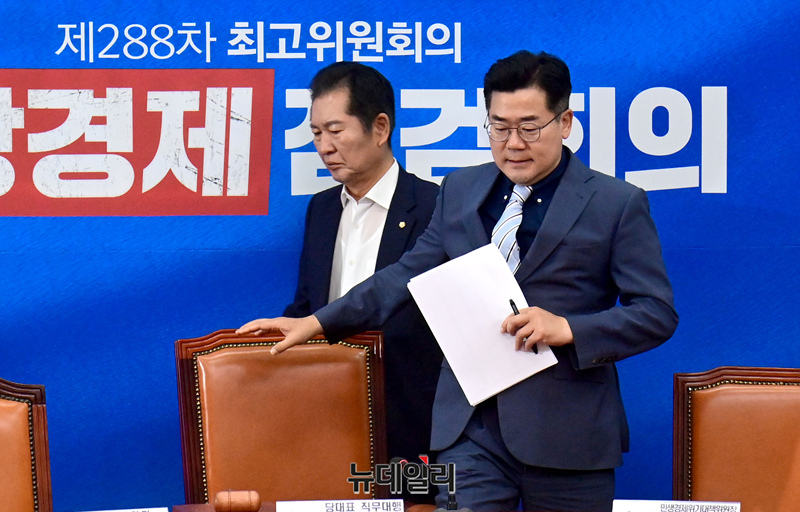 박찬대 더불어민주당 당 대표 직무대행 겸 원내대표가 7일 국회에서 열린 최고위원회의 겸 비상경제 점검회의에 참석하고 있다.