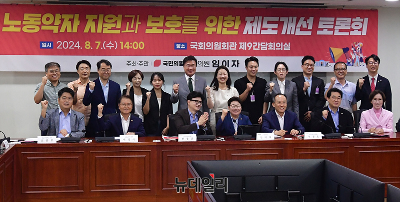 한동훈 국민의힘 당대표, 임이자 의원 등 참석자들이 7일 오후 국회 의원회관에서 열린 노동약자 지원과 보호를 위한 제도개선 토론회에서 기념촬영을 하고 있다.