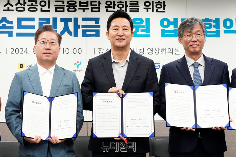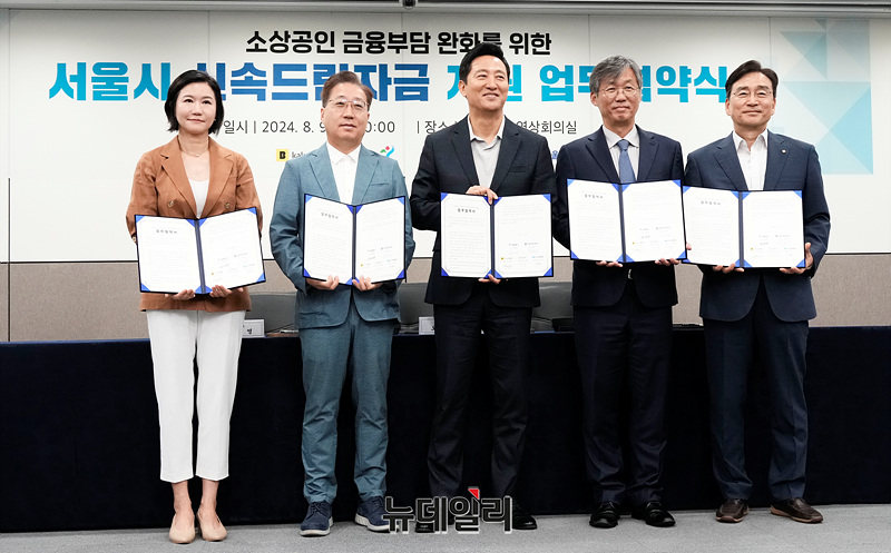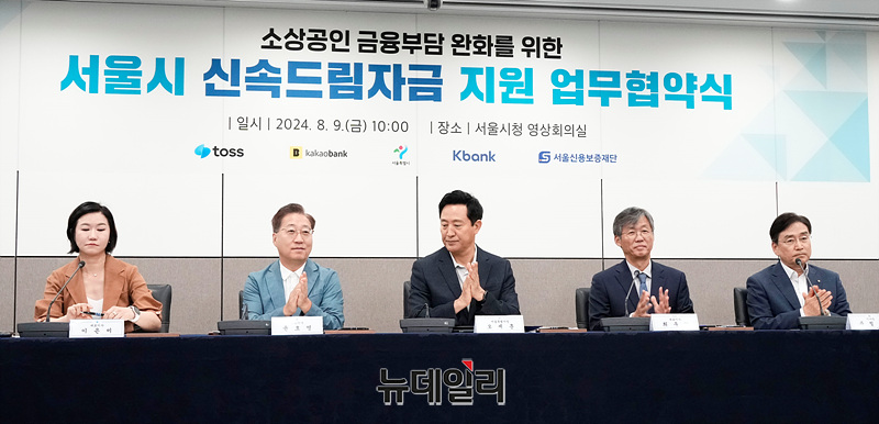 이은미 토스뱅크 대표(왼쪽부터), 윤호영 카카오뱅크 대표, 오세훈 서울시장, 최우형 케이뱅크 대표, 주철수 서울신용보증재단 이사장이 9일 오전 서울 중구 서울시청에서 열린 '서울시 신속드림자금 지원 업무협약식'에서 기념촬영을 하고 있다.