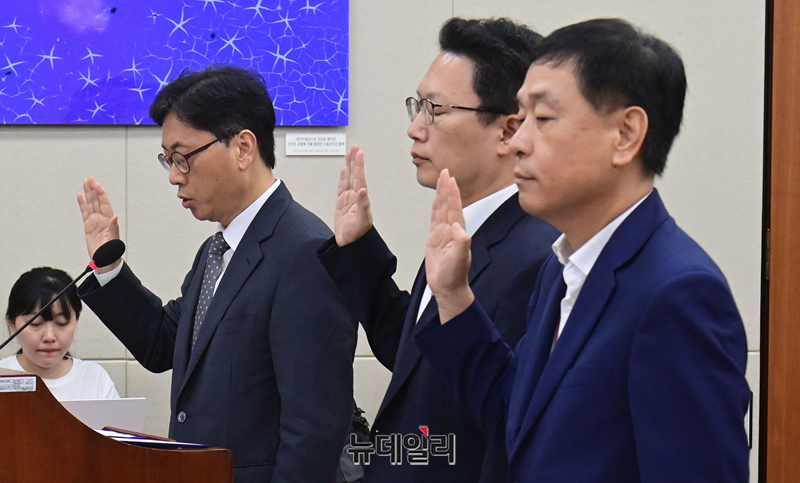 조성은 방송통신위원회 사무처장 및 증인들이 9일 국회 과학기술정보방송통신위원회에서 열린 불법적 방송문화진흥회 이사 선임 등 방송장악 관련 1차 청문회에서 증인선서를 하고 있다.
