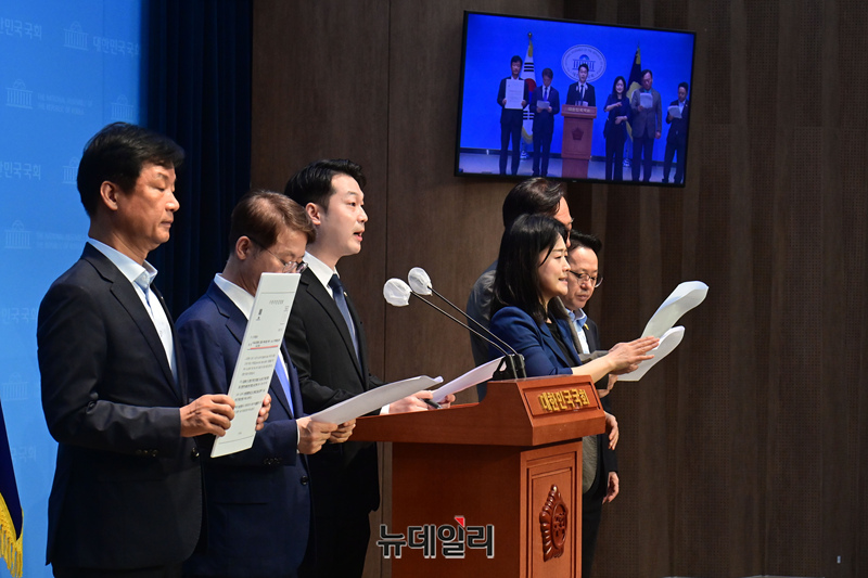 더불어민주당 정치검찰 사건 조작 특별 대책단 소속의원들이 9일 오후 국회 소통관에서 긴급기자회견을 갖고 있다.