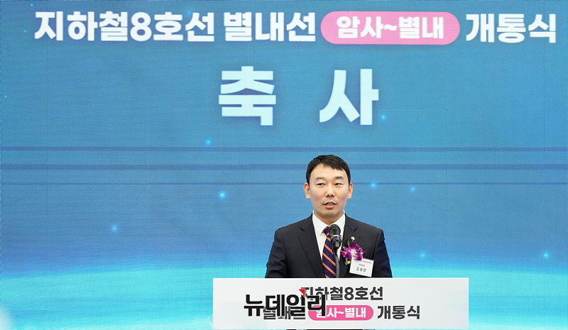 김용민 더불어민주당 의원이 9일 오후 경기 남양주 별내역에서 열린 지하철 8호선 별내선 개통식에서 축사를 하고 있다.
