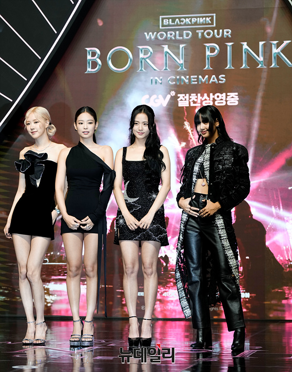 걸그룹 블랙핑크(BLACK PINK)가 9일 오후 서울 영등포구 타임스퀘어 영등포점에서 열린 '본 핑크 인 시네마스(BORN PINK IN CINEMAS)' 핑크 카펫에서 포즈를 취하고 있다.