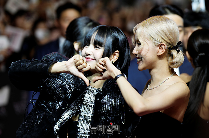 걸그룹 블랙핑크(BLACK PINK) 리사와 로제가 9일 오후 서울 영등포구 타임스퀘어 영등포점에서 열린 '본 핑크 인 시네마스(BORN PINK IN CINEMAS)' 핑크 카펫에서 포즈를 취하고 있다.