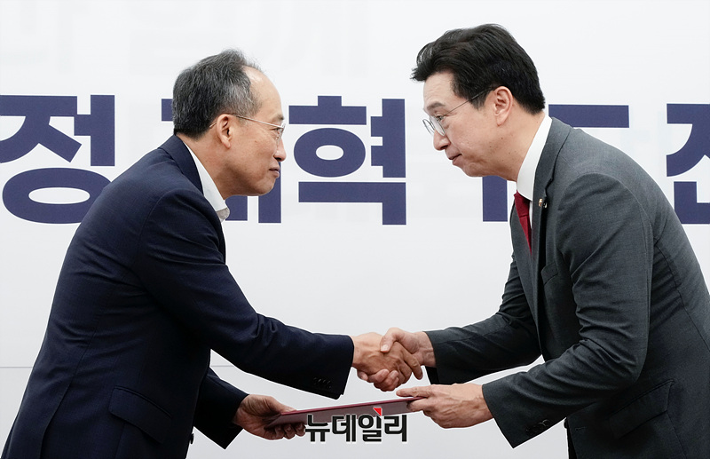 • 추경호 국민의힘 원내대표가 12일 오후 서울 여의도 국회에서 열린 포털 불공정 개혁 TF 전체회의에서 강민국 포털불공정개혁TF 위원장에게 임명장을 전달한 뒤 기념촬영을 하고 있다.