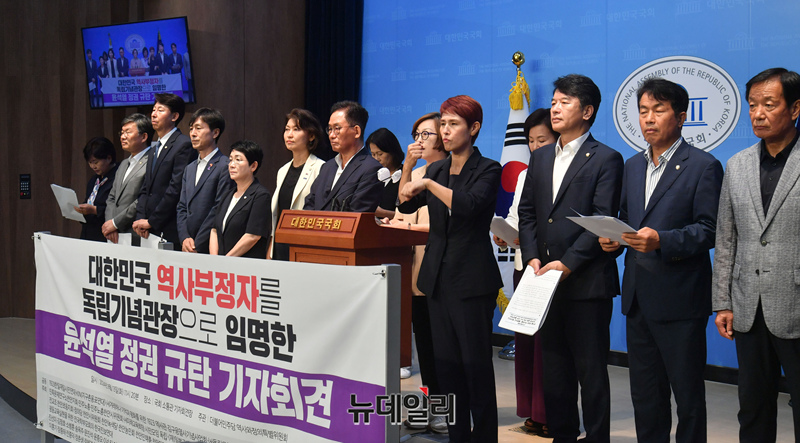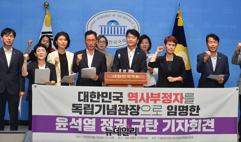 더불어민주당 역사와정의특별위원회 소속 의원 및 시민단체 관계자들이 13일 오전 국회 소통관에서 독립기념관장 임명과 관련한 윤석열 정권 규탄 기자회견을 하고 있다.