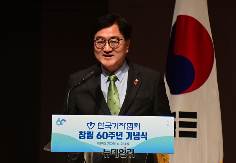 우원식 국회의장 13일 오후 서울 중구 프레스센터에서 열린 한국기자협회 창립 60주년 기념식에서 축사하고 있다.