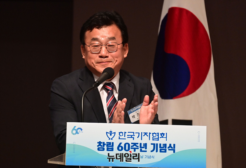 박종현 한국기자협회장이 13일 서울 중구 프레스센터에서 열린 한국기자협회 창립 60주년 기념식에서 인사말을 하고 있다.