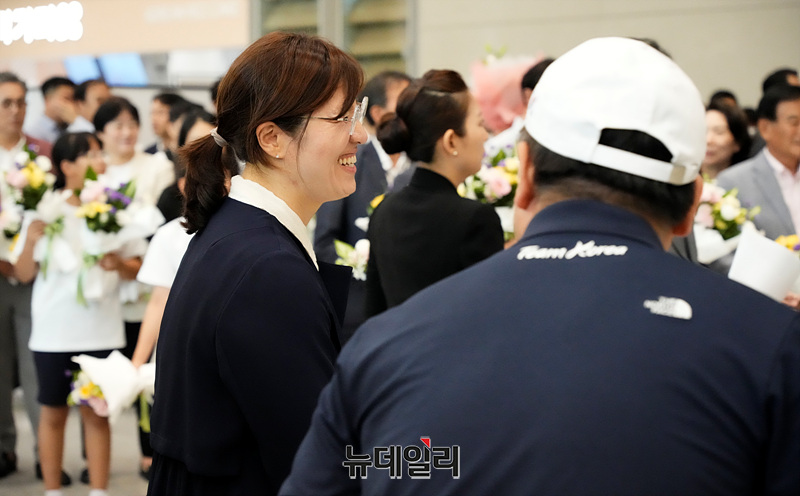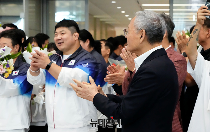 유인촌 문화체육관광부 장관과 장미란 2차관이 13일 오후 인천국제공항 2터미널을 통해 입국하는 2024 파리올림픽 선수단을 맞이하고 있다.