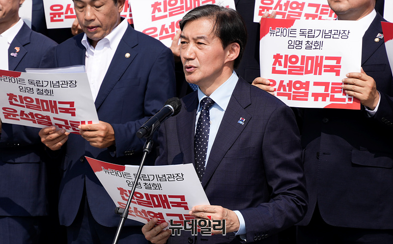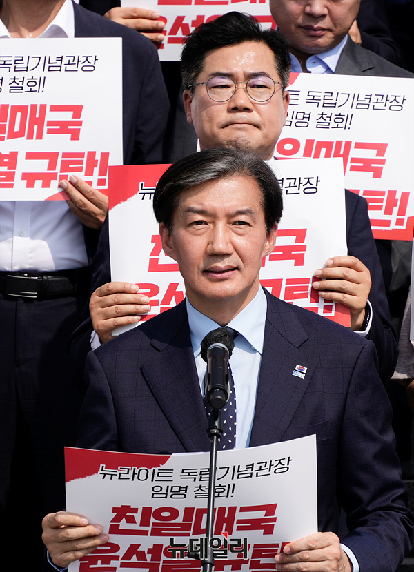 조국 조국혁신당 대표가 14일 오전 서울 여의도 국회 본청 계단에서 열린 '광복79주년 국회-시민사회1000인 선언 기자회견'에서 발언하고 있다.
