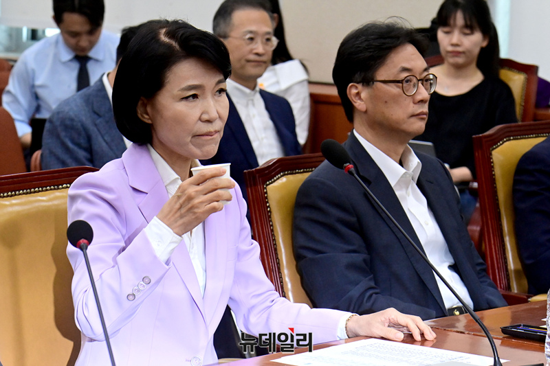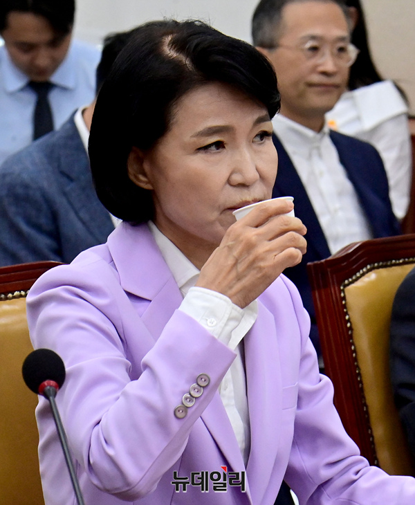 직무 정지된 이진숙 방송통신위원장이 14일 오후 국회 과학기술정보방송통신위원회에서 열린 방송장악 2차 청문회에 출석해 물을 마시고 있다.