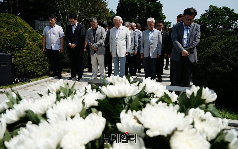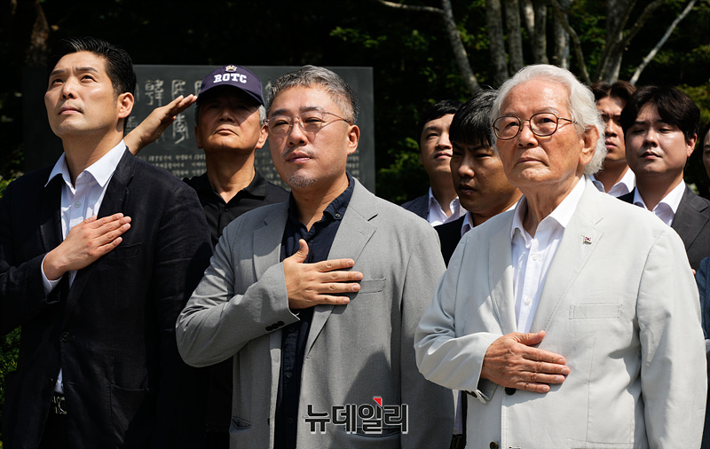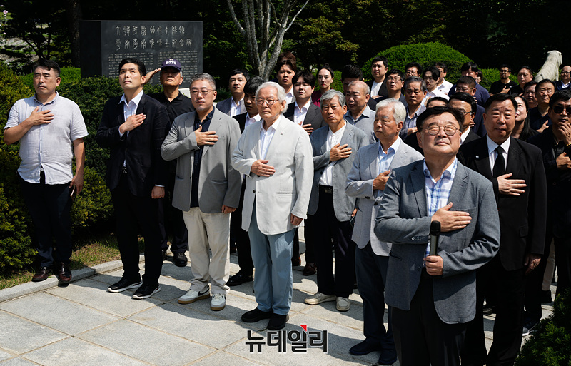 이승만 숭모 헌화회와 참석자들이 15일 오전 서울 동작구 국립서울현충원 이승만 전 대통령 묘역에서 열린 '건국대통령이승만 숭모헌화회 광복절 헌화행사'에서 국민의례를 하고 있다.