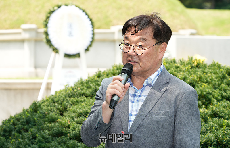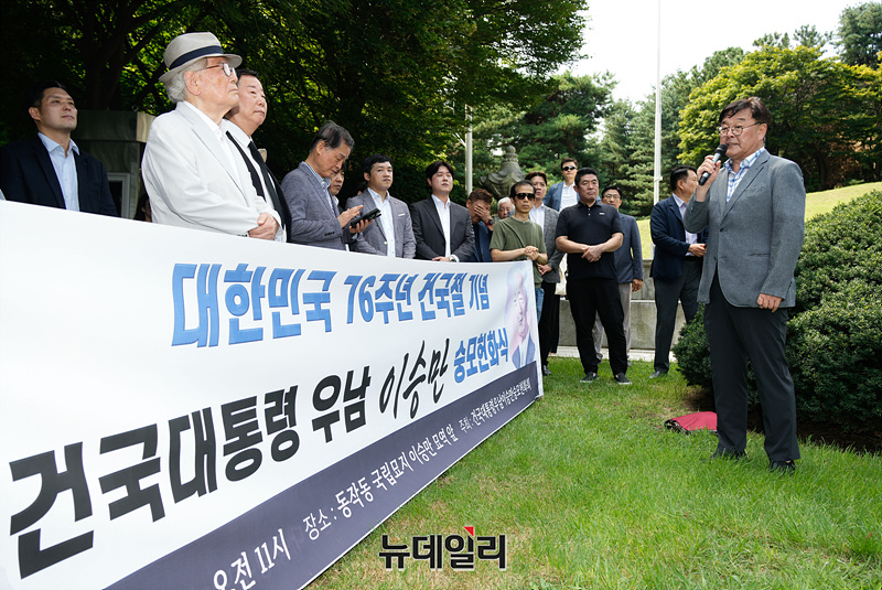 조전혁 이승만 숭모 헌화회 회장이 15일 오전 서울 동작구 국립서울현충원 이승만 전 대통령 묘역에서 열린 '건국대통령이승만 숭모헌화회 광복절 헌화행사'에서 인사말을 하고 있다.
