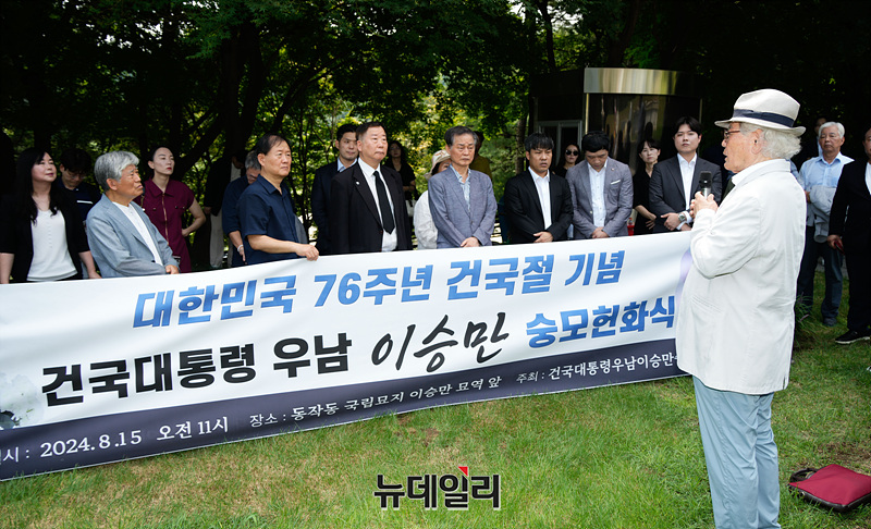 이영일 전 국회의원이 15일 오전 서울 동작구 국립서울현충원 이승만 전 대통령 묘역에서 열린 '건국대통령이승만 숭모헌화회 광복절 헌화행사'에서 인사말을 하고 있다.