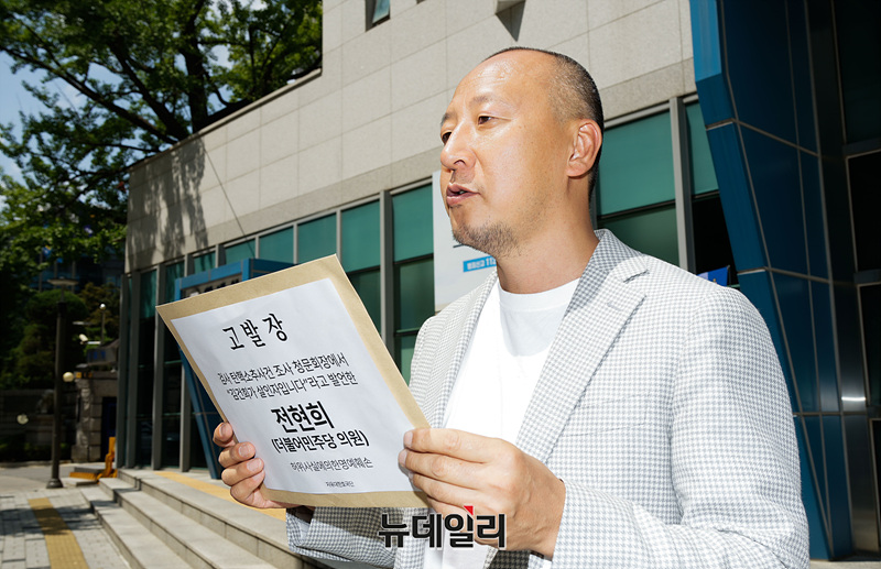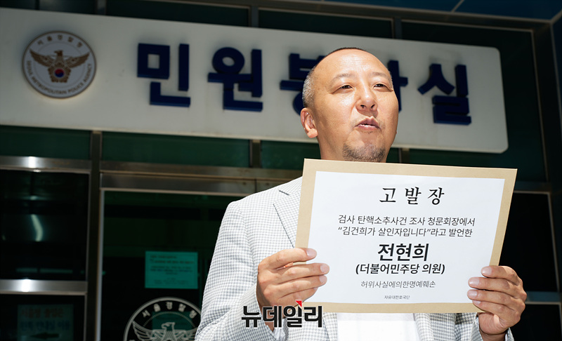 오상종 자유대한호국단 단장이 16일 오후 서울 종로구 서울경찰청에서 "김건희가 살인자"라고 발언한 전현희 더불어민주당 의원에 대해 허위사실에의한명예훼손 고발장을 접수하며 기자회견을 하고 있다.오 단장은 기자회견에서 "국회의원의 지위를 이용하고 청문회 자리를 빌어 청문회와 관련 없는 주장을 하며 본인의 인지도를 올리기 위한 것으로 밖에는 설명 안 되는 김건희 여사의 인격을 말살하는 발언에 경악하지 않을 수 없다"며 "더 이상 국회의원의 신분이 범죄 혐의를 비호하는 수단으로 악용되어서는 안 될 것"이라고 말했다.