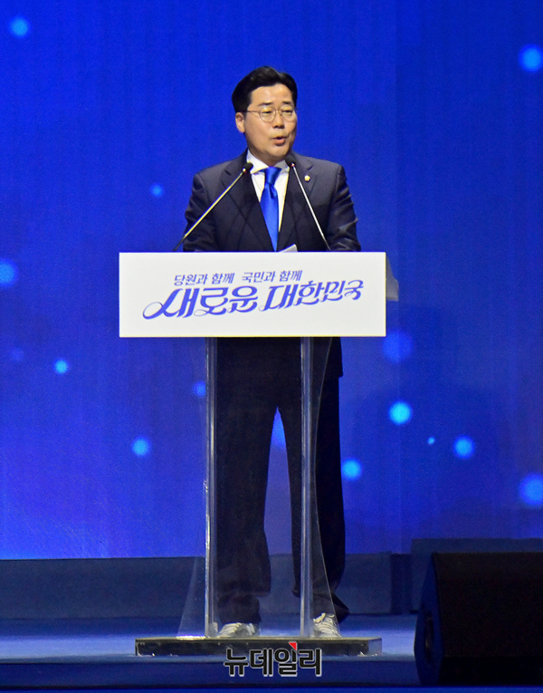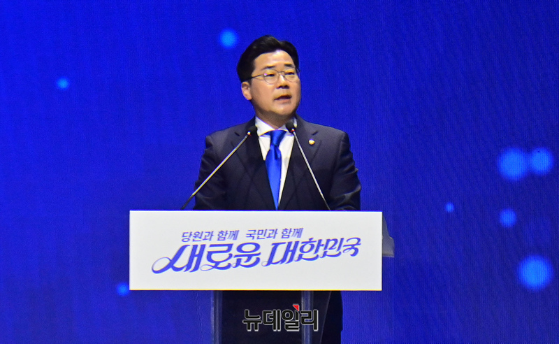 박찬대 더불어민주당 대표 직무대행 겸 원내대표가 18일 오후 서울 송파구 올림픽공원 KSPO돔에서 열린 더불어민주당 제1차 정기전국당원대회에서 인사말 하던 중 노래를 부르고 있다.