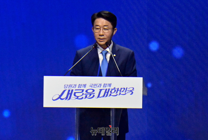 조정식 더불어민주당 전국당원대회 의장 18일 오후 서울 송파구 올림픽공원 KSPO돔에서 열린 더불어민주당 제1차 정기전국당원대회에서 인사말을 하고 있다.