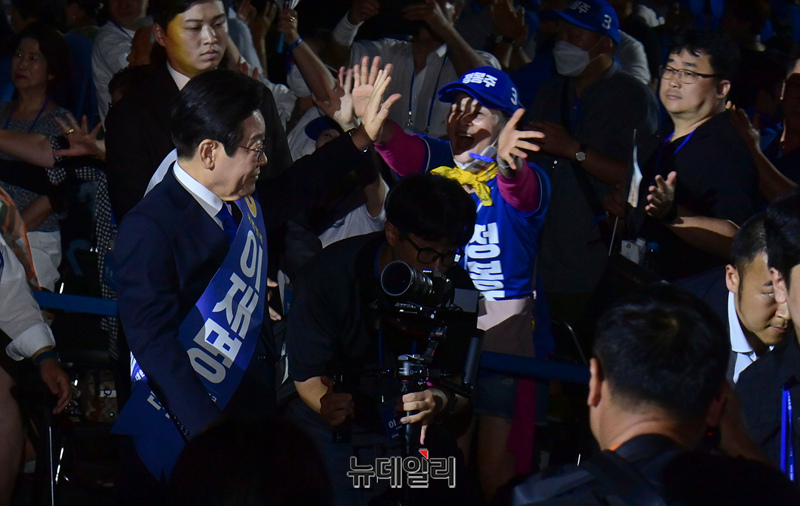 이재명 더불어민주당 당대표 후보가 18일 오후 서울 송파구 올림픽공원 KSPO돔에서 열린 더불어민주당 제1차 정기전국당원대회에 입장하며 당원들에게 손을 흔들고 있다.