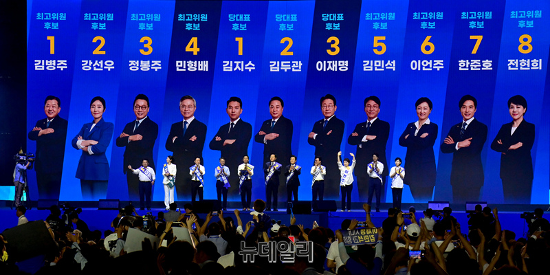 김병주, 강선우, 정봉주, 민형배 최고위원 후보, 김지수, 김두관, 이재명 당대표 후보, 김민석, 이언주, 한준호, 전현희 최고위원 후보가 18일 오후 서울 송파구 올림픽공원 KSPO돔에서 열린 더불어민주당 제1차 정기전국당원대회에서 당원들에게 인사를 하고 있다.