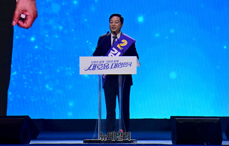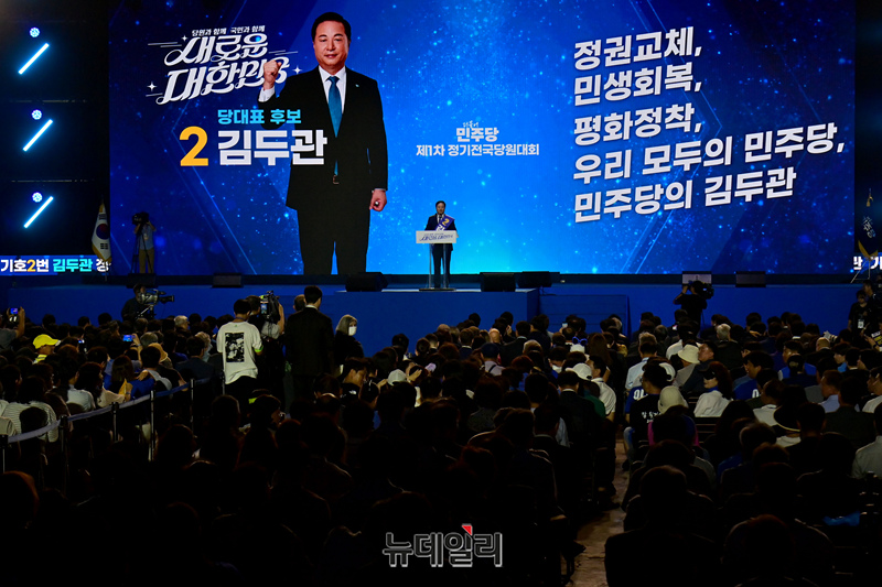 김두관 더불어민주당 당대표 후보가 18일 오후 서울 송파구 올림픽공원 KSPO돔에서 열린 더불어민주당 제1차 정기전국당원대회에서 정견발표를 하고 있다.