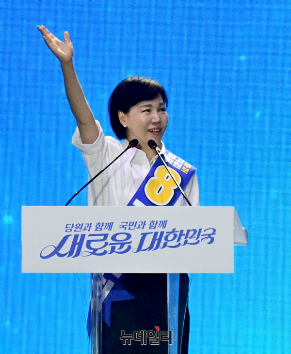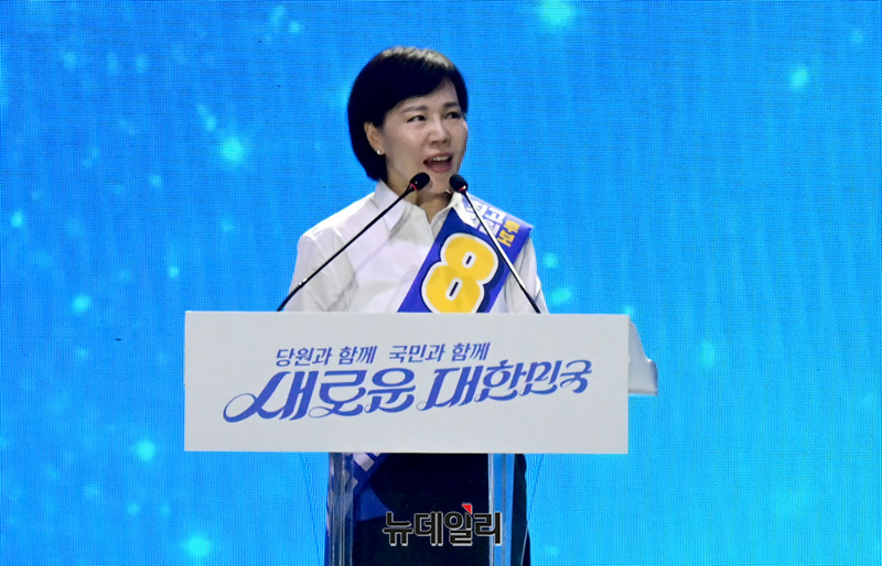 전현희 더불어민주당 최고위원 후보가 18일 오후 서울 송파구 올림픽공원 KSPO돔에서 열린 더불어민주당 제1차 정기전국당원대회에서 정견발표를 하고 있다.