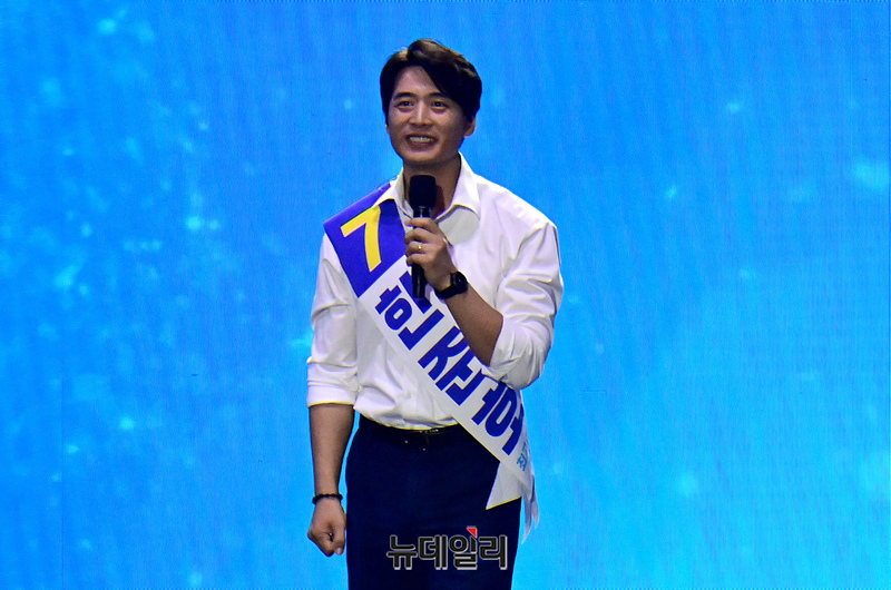 한준호 더불어민주당 최고위원 후보가 18일 오후 서울 송파구 올림픽공원 KSPO돔에서 열린 더불어민주당 제1차 정기전국당원대회에서 정견발표를 하고 있다.