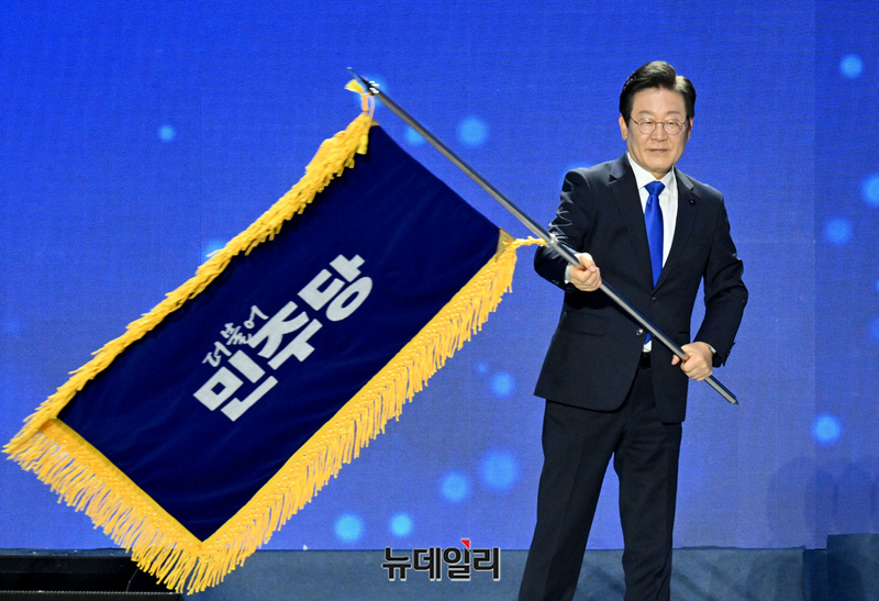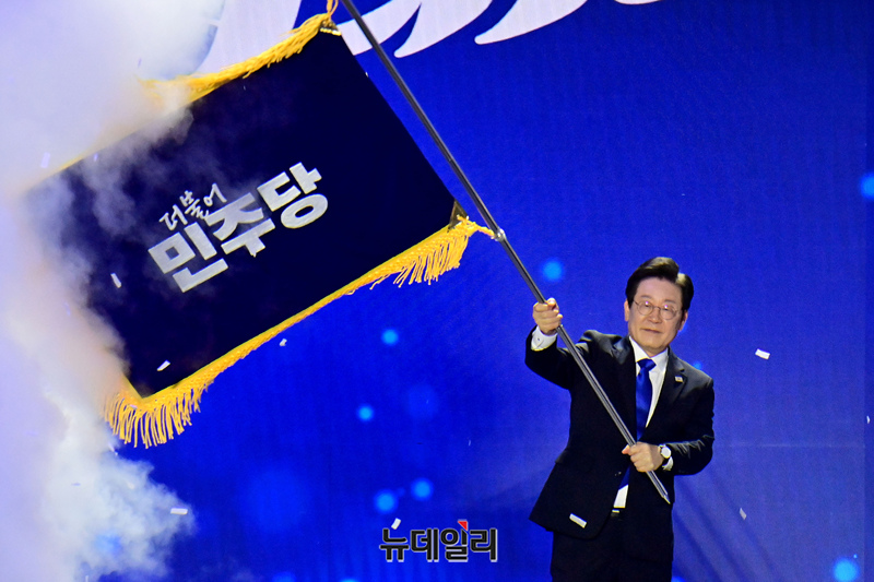 이재명 더불어민주당 신임 대표가 18일 오후 서울 송파구 올림픽공원 KSPO돔에서 열린 더불어민주당 제1차 정기전국당원대회에서 당기를 흔들고 있다.
