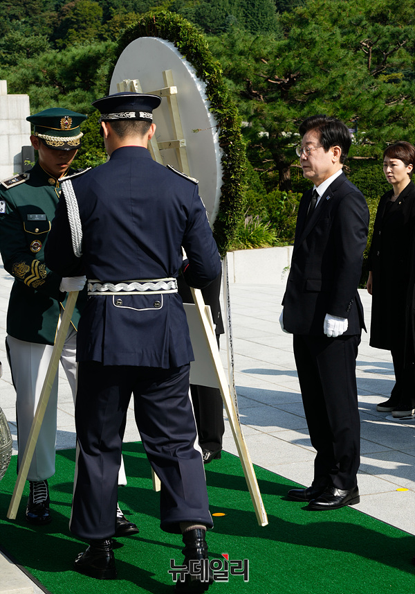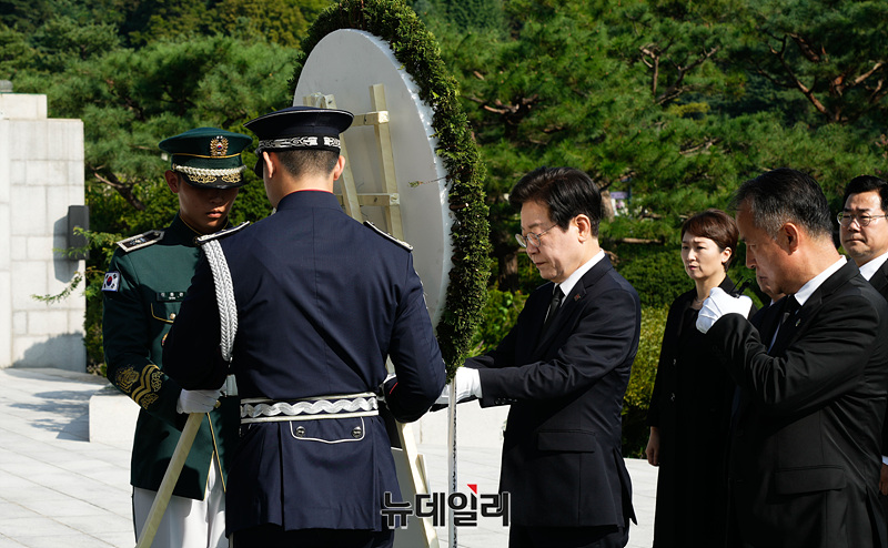 이재명 신임 더불어민주당 대표가 19일 오전 서울 동작구 국립서울현충원 현충탑에서 헌화하고 있다.