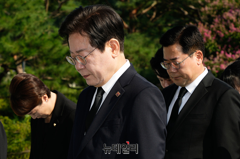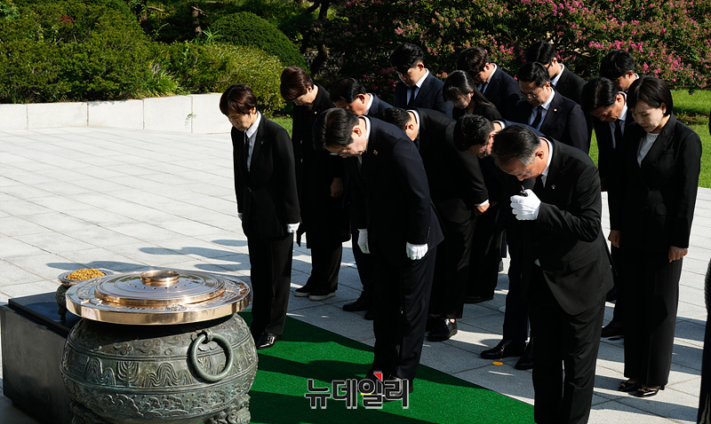 이재명 신임 더불어민주당 대표와 지도부가 19일 오전 서울 동작구 국립서울현충원 현충탑에서 참배하고 있다.