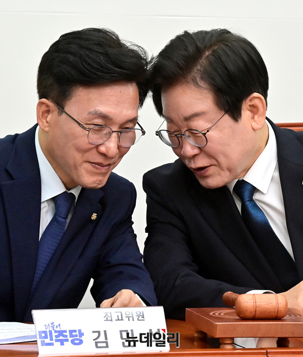이재명 더불어민주당 대표와 김민석 최고위원이 19일 오전 국회에서 열린 최고위원회의에 참석해 대화를 나누고 있다.