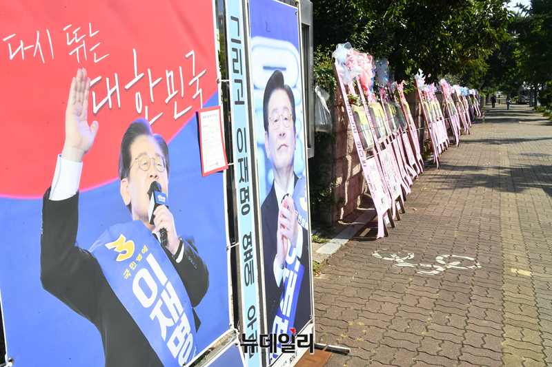 이재명 더불어민주당 대표 연임 축하 화환이 19일 오전 국회 정문 앞에 놓여있다. 이 대표는 전당대회에서 85.40%의 득표율로 당대표에 당선 됐다.