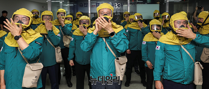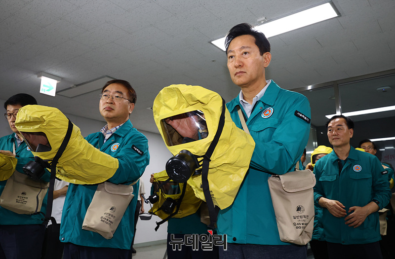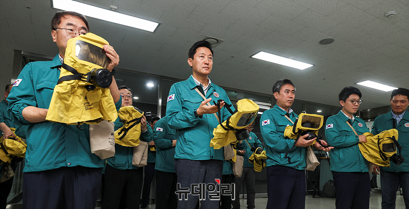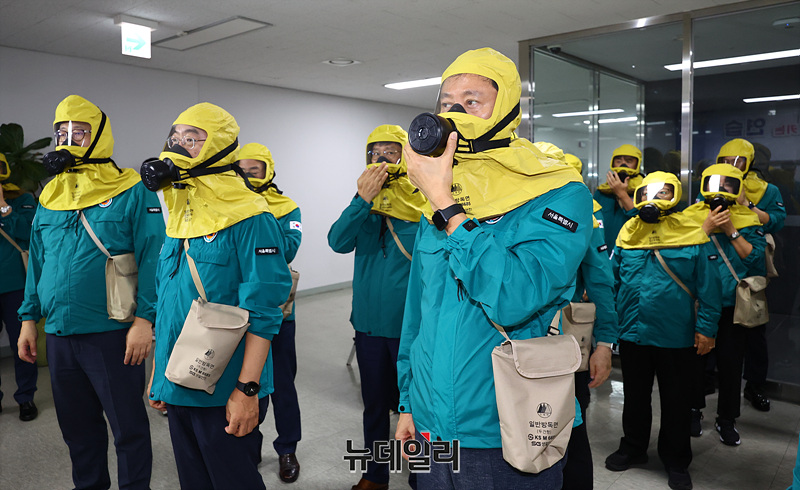 오세훈 서울시장이 19일 오후 서울 중구 서울시청에서 열린 2024 을지연습 연계 화생방 상황 훈련에서 방독면 착용 훈련을 하고 있다.