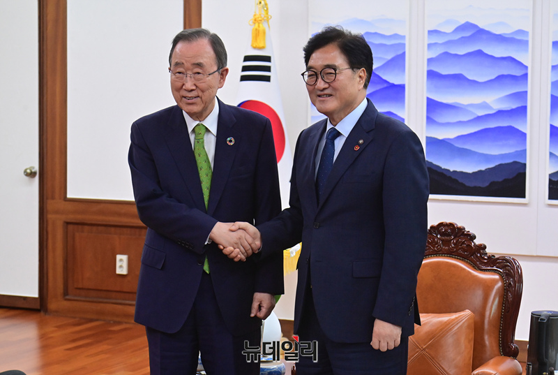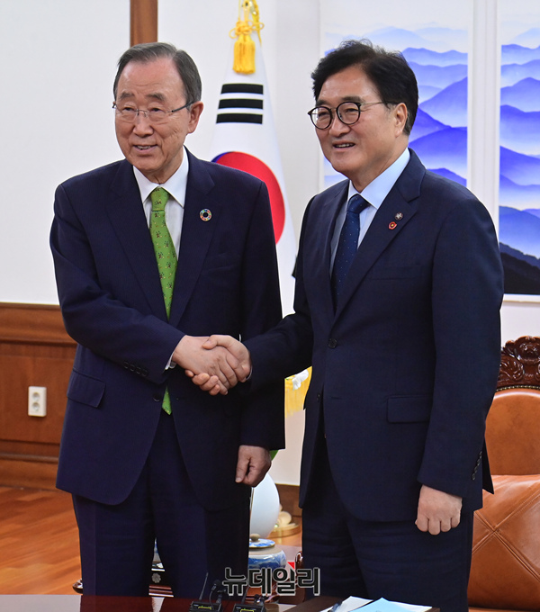 우원식 국회의장이 19일 오후 국회에서 반기문 전 유엔 사무총장을 접견하고 있다.