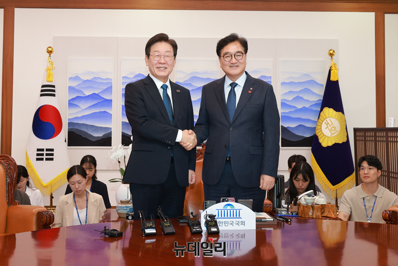 이재명 더불어민주당 대표가 19일 오후 국회에서 우원식 국회의장을 예방해 기념촬영을 하고 있다