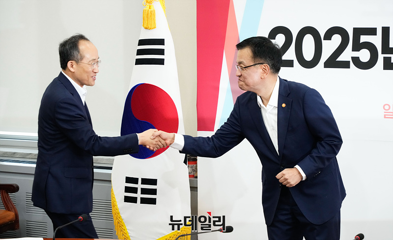 추경호 국민의힘 원내대표와 최상목 경제부총리 겸 기획재정부 장관이 20일 오전 서울 여의도 국회에서 열린 2025년도 예산안 관련 당·정협의회에서 인사를 나누고 있다.